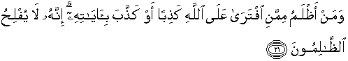 21. Dan siapakah yang lebih aniaya daripada orang yang membuat-buat suatu kedustaan terhadap Allah, atau mendustakan ayat-ayat-Nya? Sesungguhnya orang-orang yang aniaya itu tidak mendapat keberuntungan.