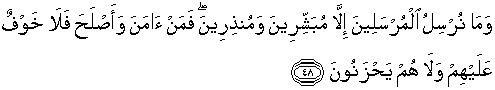 48. Dan tidaklah Kami mengutus para rasul itu melainkan untuk memberikan kabar gembira dan memberi peringatan. Barangsiapa yang beriman dan mengadakan perbaikan