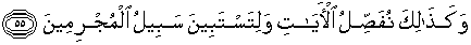 55. Dan demikianlah Kami terangkan ayat-ayat Al-Quran (supaya jelas jalan orang-orang yang saleh, dan supaya jelas (pula) jalan orang-orang yang berdosa.