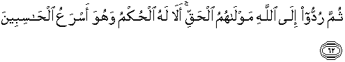 62. Kemudian mereka (hamba Allah) dikembalikan kepada Allah, Penguasa mereka yang sebenarnya. Ketahuilah bahwa segala hukum (pada hari itu) kepunyaanNya. Dan Dialah Pembuat Perhitungan yang paling cepat.