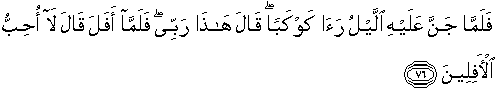 76. Ketika malam telah gelap, dia melihat sebuah bintang (lalu) dia berkata: "Inilah Tuhanku", tetapi tatkala bintang itu tenggelam dia berkata: "Saya tidak suka kepada yang tenggelam."