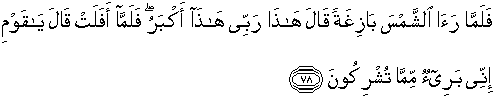 78. Kemudian tatkala ia melihat matahari terbit, dia berkata: "Inilah Tuhanku, ini yang lebih besar." Maka tatkala matahari itu terbenam, dia berkata: "Hai kaumku, sesungguhnya aku berlepas diri dari apa yang kamu persekutukan.