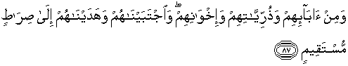 87. Dan Kami lebihkan (pula) derajat sebahagian dari bapak-bapak mereka, keturunan dan saudara-saudara mereka. Dan Kami telah memilih mereka (untuk menjadi nabi-nabi dan rasul-rasul) dan Kami menunjuki mereka ke jalan yang lurus.