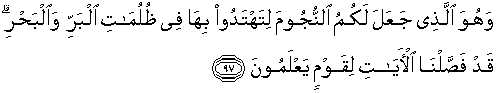 97. Dan Dialah yang menjadikan bintang-bintang bagimu, agar kamu menjadikannya petunjuk dalam kegelapan di darat dan di laut. Sesungguhnya Kami telah menjelaskan tanda-tanda kebesaran (Kami) kepada orang-orang yang mengetahui.