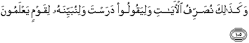 105. Demikianlah Kami mengulang-ulangi ayat-ayat Kami supaya (orang-orang yang beriman mendapat petunjuk) dan supaya orang-orang