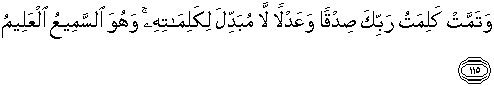 115. Telah sempurnalah kalimat Tuhanmu (Al-Quran) sebagai kalimat yang benar dan adil. Tidak ada yang dapat merobah robah kalimat-kalimat-Nya dan Dia lah yang Maha Mendenyar lagi Maha Mengetahui.