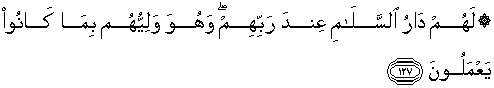 127. Bagi mereka (disediakan) darussalam (syurga) pada sisi Tuhannya dan Dialah Pelindung mereka disebabkan amal-amal saleh yang selalu mereka kerjakan.