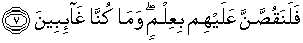 7. maka sesungguhnya akan Kami kabarkan kepada mereka (apa-apa yang telah mereka perbuat), sedang (Kami) mengetahui (keadaan mereka), dan Kami sekali-kali tidak jauh (dari mereka).