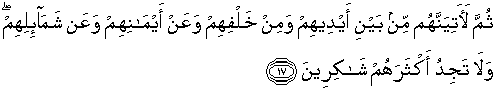 17. kemudian saya akan mendatangi mereka dari muka dan dari belakang mereka, dari kanan dan dari kiri mereka. Dan Engkau tidak akan mendapati kebanyakan mereka bersyukur (taat).