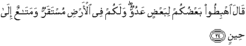 24. Allah berfirman: "Turunlah kamu sekalian, sebahagian kamu menjadi musuh bagi sebahagian yang lain. Dan kamu mempunyai tempat kediaman dan kesenangan (tempat mencari kehidupan) di muka bumi sampai waktu yang telah ditentukan."