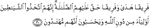 30. Sebahagian diberi-Nya petunjuk dan sebahagian lagi telah pasti kesesatan bagi mereka. Sesungguhnya mereka menjadikan syaitan-syaitan pelindung (mereka) selain Allah, dan mereka mengira bahwa mereka mendapat petunjuk.