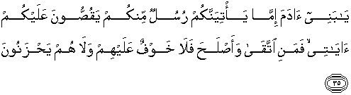 35. Hai anak-anak Adam, jika datang kepadamu rasul-rasul daripada kamu yang menceritakan kepadamu ayat-ayat-Ku, maka barangsiapa yang bertakwa dan mengadakan perbaikan, tidaklah ada kekhawatiran terhadap mereka dan tidak (pula) mereka bersedih hati.