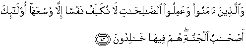 42. dan orang-orang yang beriman dan mengerjakan amal-amal yang saleh, Kami tidak memikulkan kewajiban kepada diri seseorang melainkan sekedar kesanggupannya, mereka itulah penghuni-penghuni surga; mereka kekal di dalamnya.