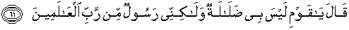 61. Nuh menjawab: "Hai kaumku, tak ada padaku kesesatan sedikitpun tetapi aku adalah utusan dari Tuhan semesta alam."