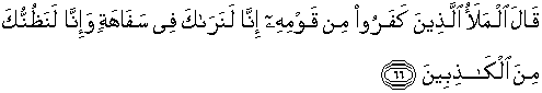 66. Pemuka-pemuka yang kafir dari kaumnya berkata: "Sesungguhnya kami benar benar memandang kamu dalam keadaan kurang akal dan sesungguhnya kami menganggap kamu termasuk orang orang yang berdusta."