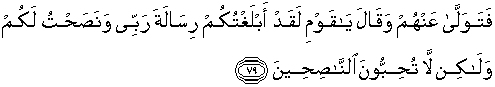 79. Maka Shaleh meninggalkan mereka seraya berkata: "Hai kaumku sesungguhnya aku telah menyampaikan kepadamu amanat Tuhanku, dan aku telah memberi nasehat kepadamu, tetapi kamu tidak menyukai orang-orang yang memberi nasehat."