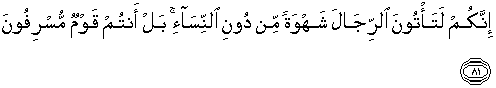 81. Sesungguhnya kamu mendatangi lelaki untuk melepaskan nafsumu (kepada mereka), bukan kepada wanita, malah kamu ini adalah kaum yang melampaui batas.