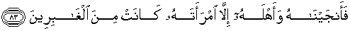 83. Kemudian Kami selamatkan dia dan pengikut-pengikutnya kecuali isterinya; dia termasuk orang-orang yang tertinggal (dibinasakan).