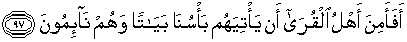 97. Maka apakah penduduk negeri-negeri itu merasa aman dari kedatangan siksaan Kami kepada mereka di malam hari di waktu mereka sedang tidur?