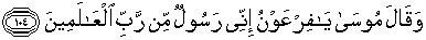 104. Dan Musa berkata: "Hai Fir'aun, sesungguhnya aku ini adalah seorang utusan dari Tuhan semesta alam,