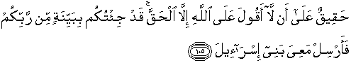 105. wajib atasku tidak mengatakan sesuatu terhadap Allah, kecuali yang hak. Sesungguhnya aku datang kepadamu dengan membawa bukti yang nyata dari Tuhanmu, maka lepaskanlah Bani Israil (pergi) bersama aku."