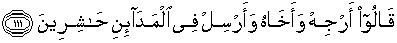 111. Pemuka-pemuka itu menjawab: "Beri tangguhlah dia dan saudaranya serta kirimlah ke kota-kota beberapa orang yang akan mengumpulkan (ahli-ahli sihir),
