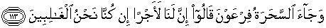 113. Dan beberapa ahli sihir itu datang kepada Fir'aun mengatakan: "(Apakah) sesungguhnya kami akan mendapat upah, jika kamilah yang menang?"