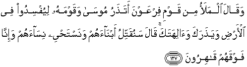 kerusakan di negeri ini (Mesir) dan meninggalkan kamu serta tuhan-tuhanmu?." Fir'aun menjawab: "Akan kita bunuh anak-anak lelaki mereka