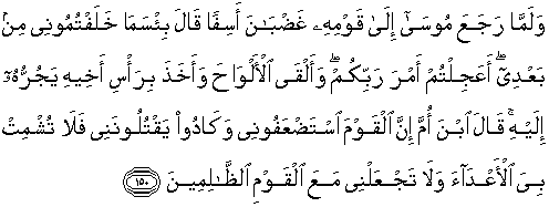 150. Dan tatkala Musa telah kembali kepada kaumnya dengan marah dan