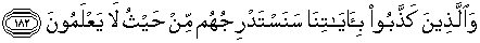 182. Dan orang-orang yang mendustakan ayat-ayat Kami, nanti Kami akan menarik mereka dengan berangaur-angsur (ke arah kebinasaan), dengan cara yang tidak mereka ketahui.