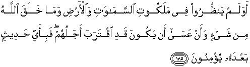 185. Dan apakah mereka tidak memperhatikan kerajaan langit dan bumi dan segala sesuatu yang diciptakan Allah, dan kemungkinan telah dekatnya kebinasaan mereka? Maka kepada berita manakah lagi mereka akan beriman sesudah Al Quran itu?