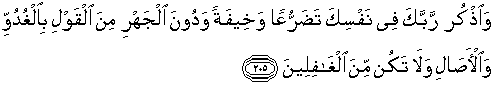 205. Dan sebutlah (nama) Tuhanmu dalam hatimu dengan merendahkan diri dan rasa takut, dan dengan tidak mengeraskan suara, di waktu pagi dan petang, dan janganlah kamu termasuk orang-orang yang lalai.