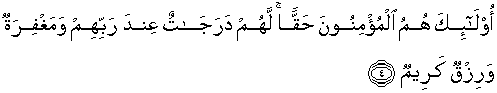 4. Itulah orang-orang yang beriman dengan sebenar-benarnya. Mereka akan memperoleh beberapa derajat ketinggian di sisi Tuhannya dan ampunan serta rezki (nikmat) yang mulia.