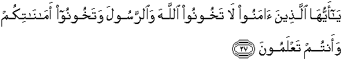 27. Hai orang-orang yang beriman, janganlah kamu mengkhianati Allah dan Rasul (Muhammad) dan (juga) janganlah kamu mengkhianati amanat-amanat yang dipercayakan kepadamu, sedang kamu mengetahui.