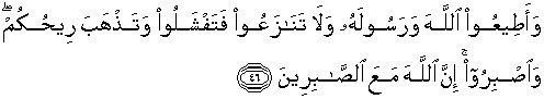46. Dan taatlah kepada Allah dan Rasul-Nya dan janganlah kamu berbantah-bantahan, yang menyebabkan kamu menjadi gentar dan hilang kekuatanmu dan bersabarlah. Sesungguhnya Allah beserta orang-orang yang sabar.