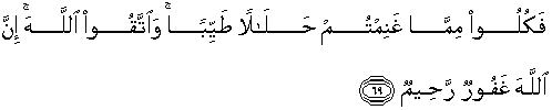 69. Maka makanlah dari sebagian rampasan perang yang telah kamu ambil itu, sebagai makanan yang halal lagi baik, dan bertakwalah kepada Allah; sesungguhnya Allah Maha Pengampun lagi Maha Penyayang.