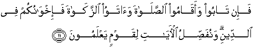 11. Jika mereka bertaubat, mendirikan sholat dan menunaikan zakat, maka (mereka itu) adalah saudara-saudaramu seagama. Dan Kami menjelaskan ayat-ayat itu bagi kaum yang mengetahui.