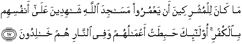 17. Tidaklah pantas orang-orang musyrik itu memakmurkan mesjid-mesjid Allah, sedang mereka mengakui bahwa mereka sendiri kafir. Itulah orang-orang yang sia-sia pekerjaannya, dan mereka kekal di dalam neraka.