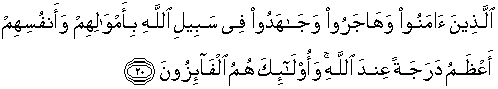 20. orang-orang yang beriman dan berhijrah serta berjihad di jalan Allah dengan harta, benda dan diri mereka, adalah lebih tinggi derajatnya di sisi Allah; dan itulah orang-orang yang mendapat kemenangan.