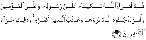 26. Kemudian Allah menurunkan ketenangan kepada RasulNya dan kepada