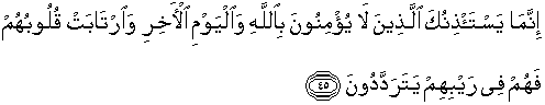 45. Sesungguhnya yang akan meminta izin kepadamu, hanyalah orang-orang yang tidak beriman kepada Allah dan hari kemudian, dan hati mereka ragu-ragu, karena itu mereka selalu bimbang dalam keraguannya.