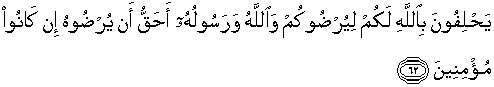 62. Mereka bersumpah kepada kamu dengan (nama) Allah untuk mencari keridhaanmu, padahal Allah dan Rasul-Nya itulah yang lebih patut mereka cari keridhaannya jika mereka adalah orang-orang yang mukmin.