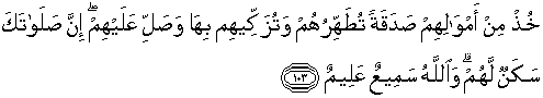 103. Ambillah zakat dari sebagian harta mereka, dengan zakat itu kamu