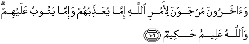 106. Dan ada (pula) orang-orang lain yang ditangguhkan sampai ada keputusan Allah; adakalanya Allah akan mengazab mereka dan adakalanya Allah akan menerima taubat mereka. Dan Allah Maha Mengetahui lagi Maha Bijaksana.
