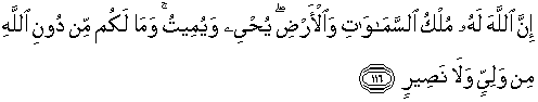 116. Sesungguhnya kepunyaan Allah-lah kerajaan langit dan bumi. Dia menghidupkan dan mematikan. Dan sekali-kali tidak ada pelindung dan penolong bagimu selain Allah.