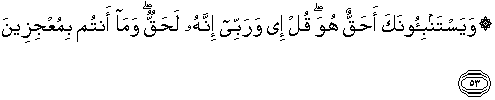 53. Dan mereka menanyakan kepadamu: "Benarkah (azab yang dijanjikan) itu? Katakanlah: "Ya, demi Tuhanku, sesungguhnya azab itu adalah benar dan kamu sekali-kali tidak bisa luput (daripadanya)."