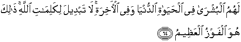64. Bagi mereka berita gembira di dalam kehidupan di dunia dan (dalam kehidupan} di akhirat. Tidak ada perobahan bagi kalimat-kalimat (janji-janji) Allah. Yang demikian itu adalah kemenangan yang besar.