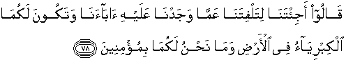78. Mereka berkata: "Apakah kamu datang kepada kami untuk memalingkan kami dari apa yang kami dapati nenek moyang kami mengerjakannya