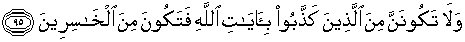 95. Dan sekali-kali janganlah kamu termasuk orang-orang yang mendustakan ayat-ayat Allah yang menyebabkan kamu termasuk orang-orang yang rugi.