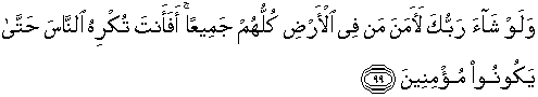 99. Dan jikalau Tuhanmu menghendaki, tentulah beriman semua orang yang di muka bumi seluruhnya. Maka apakah kamu (hendak) memaksa manusia supaya mereka menjadi orang-orang yang beriman semuanya ?